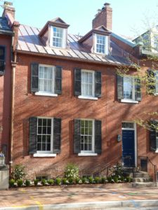Perched on what was once called “Rocky Hill” or “Hessian Hill,” this little house — just 12 feet wide and 28 feet deep — is one of several remaining from a set of 10 Federal-style row houses built by land speculator Thomas E. Waggaman and sold in 1886 for $750 each. Waggaman, who hailed from a prominent family on the Eastern Shore of Maryland, lived just a few blocks away at 3300 O St., near St. John’s Church. A prominent Catholic layman and patron of the arts, he was included in the Washington Elite List of 1896. Following his initial venture in Georgetown, Waggaman invested in the development of Woodley Park and Cleveland Park.