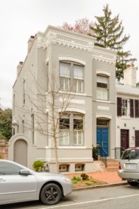 This Italianate-style house was built in 1860. When Georgetown jewelry designer and shop owner Bobbie Medlin purchased it in 2011, she thoroughly modernized the home. Medlin kept the original wood floors, where possible, but painted them pale grey to match the Italian travertine floors on the first level, which are in the Versailles pattern. Even though the fireplaces and unusual door moldings may be original to the house, everything is sleek and modern. The present owners, who purchased the house in 2014, continue in this style.