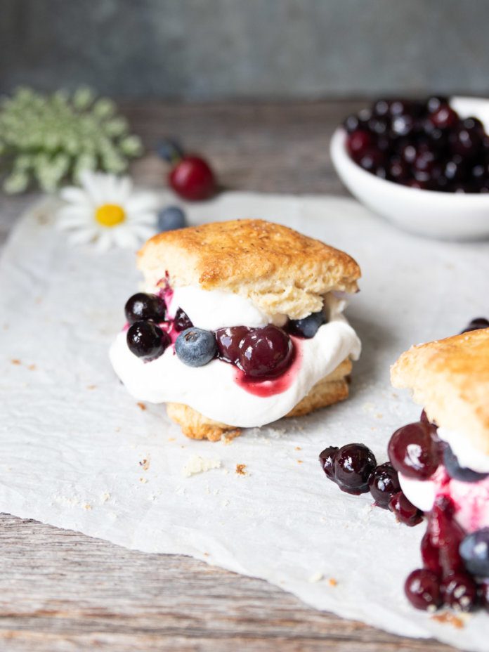 These are strawberry shortcake’s grown-up, sophisticated, oh-so-elegant cousin. Everyone has had strawberry shortcake; it’s a classic that we all love. But I wanted to mix things up using blueberries and cherries and make something worthy of a spring/almost-summertime backyard soirée.