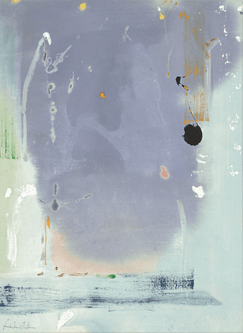 This acrylic on canvas by American abstractionist Helen Frankenthaler (1928-2011), a major contributor to postwar painting, was acquired by its present owner from the John Berggruen Gallery in San Francisco. It is signed “Frankenthaler” on the lower left corner and signed and dated “Frankenthaler 1982” on the reverse.