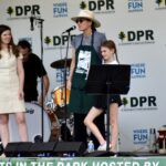 - On the stage, CAG Executive Director Brittany Sawyer with CAG Concert in the Park event volunteer lead Jessica Bieligk and her daughter. Photo by Bill Starrels.