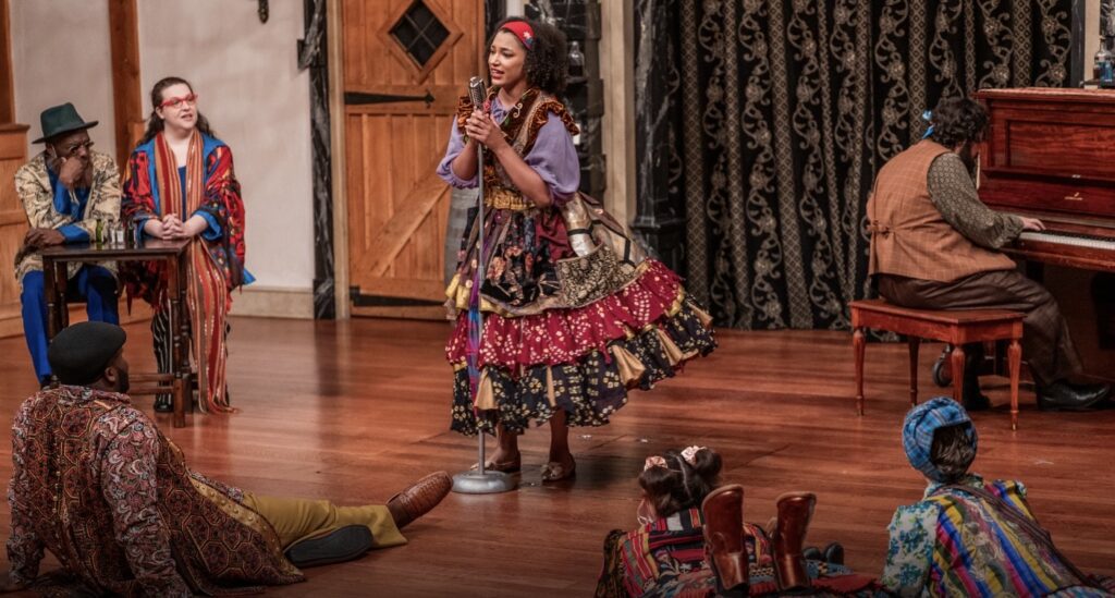 We are treated to “Ain’t Misbehavin’” in the current production of “The Winter’s Tale,” directed by Raphael Massie, which takes cues from the Harlem Renaissance. Baby Perdita is left under an upright piano and the character Time, played by Barnes in a canary yellow suit, belts out “Blue Skies.” Also winning are L James as “Bohemian” King Polixenes and Sara J. Griffin as “Sicilian” gentlewoman Paulina, who is anything but gentle in rebuking the raging, and later repentant, King Leontes, played by Friend.