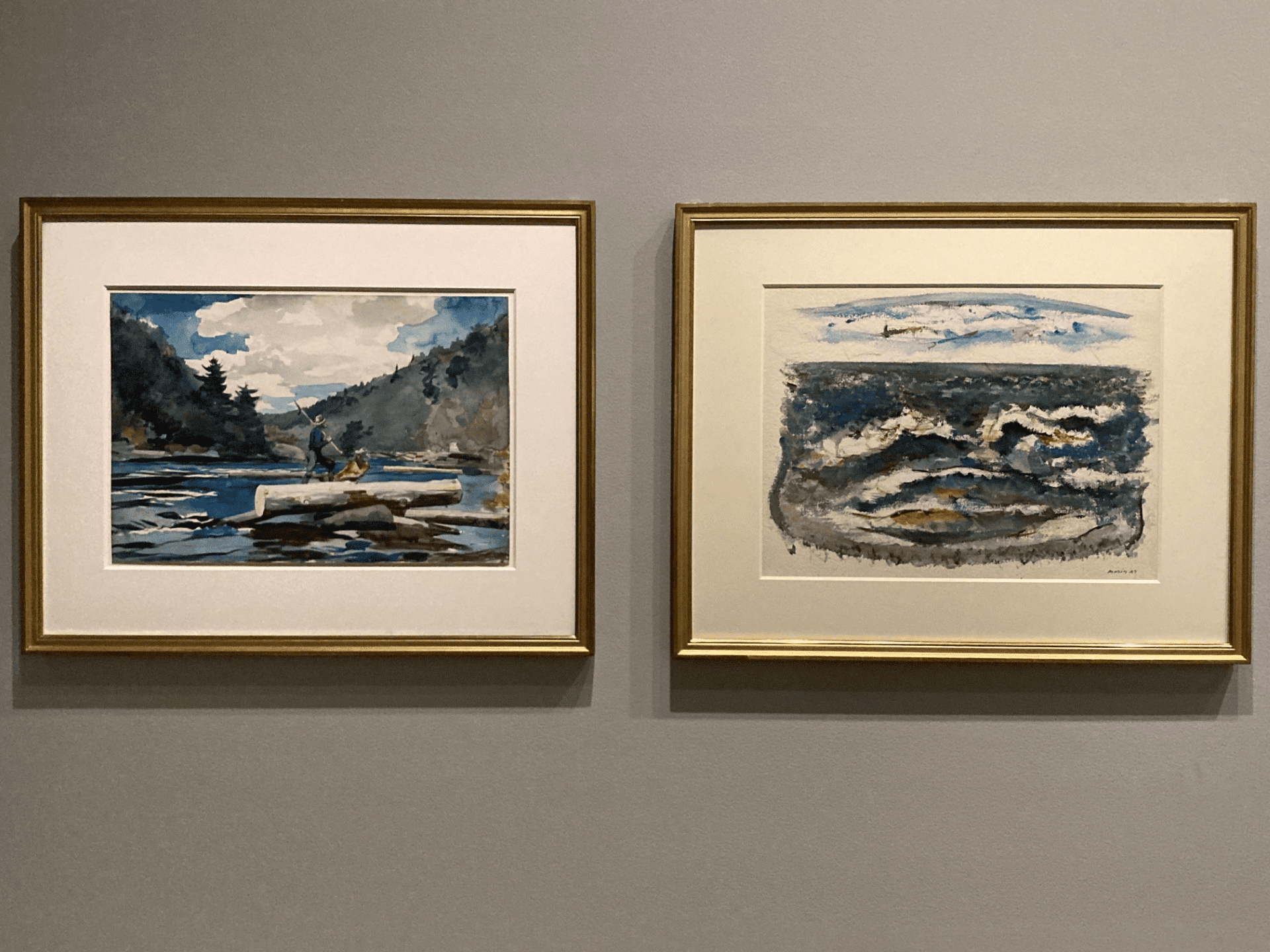 Left: “Hudson River, Logging,” 1891-92. Winslow Homer. Right: “Flint Isle, Maine — No. 1,” 1947. John Marin. Photo by Richard Selden.
