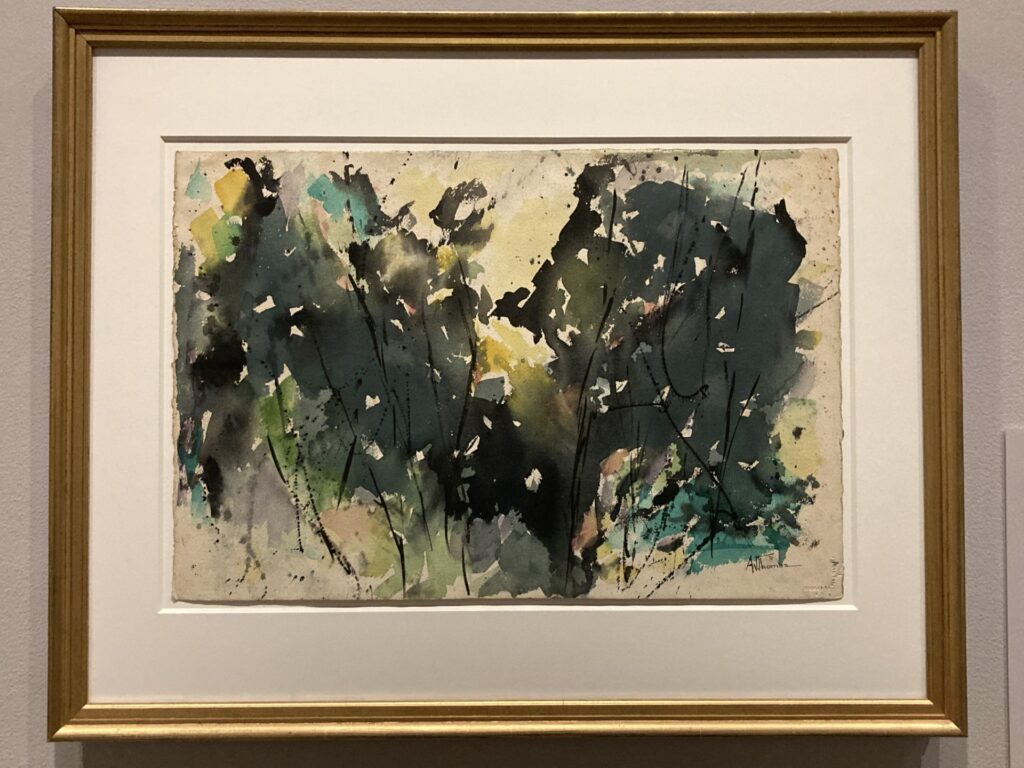 Also in that room are works unlike any of the others. Romanian American Saul Steinberg, known for his surreal New Yorker art, is represented by “Three Landscapes” of 1974 (in a single frame), in which tiny silhouetted figures appear lost and/or awestruck amid bleak vistas. Two circa-1927 pieces, “Impression of the Plains” and “Winter,” by Wilson Irvine, an Illinois-born member of the Lyme, Connecticut, art colony, are likewise unworldly, though whirlwinds of color. Per the label, Irvine’s experimental technique involved marbling the paper by placing it face down in a tray of water with stirred-up drops of colored oil, then using touches of watercolor and pastel “to define figures and to generate a sense of landscape and sky.”
