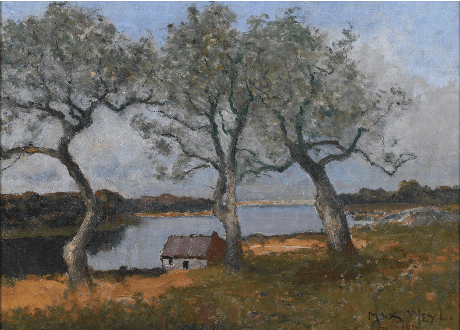 This framed oil by Max Weyl (1837-1914) sold for well over twice its high estimate. Painted in 1912, it shows a south-facing view from the Rosslyn, Virginia, shore, across from D.C. At the time, the channel between Roosevelt Island and the Virginia shore was referred to as “Little River.” Weyl, who apprenticed as a watchmaker in Germany, immigrated to America in 1853 and opened a jeweler’s store on 7th Street NW in Washington, D.C., four years later.