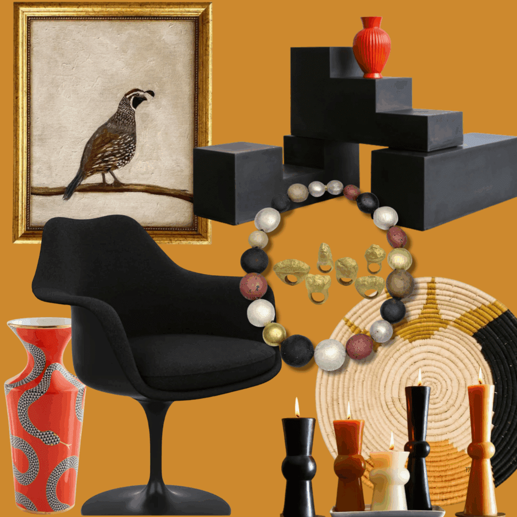 This is the season when homes embrace both the richness of color and the crispness of modern form—bold yet elegant. Picture matte black and deep neutrals against golden ochre, like fall leaves at their peak. The Lumens Tulip armchair adds sculptural presence, while a B&B Italia coffee table brings sleek Italian modernism. A fiery vermillion Jonathan Adler Snake Vase injects playful sophistication.
