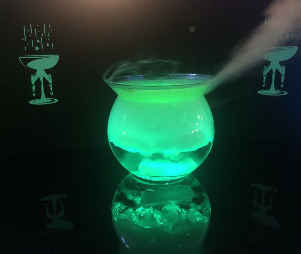 My next foray is the “Fifth Ele-mint,” a glowing, Martian green, cucumber-mint creation that comes with special sipping instructions. The drink itself is served in the triangular bowl of a martini glass, which is balanced atop an illuminated sphere of gas. The radiant hue of this tipple is exaggerated by a shimmering constellation formed on the surface by droplets of house-crafted mint olive oil.