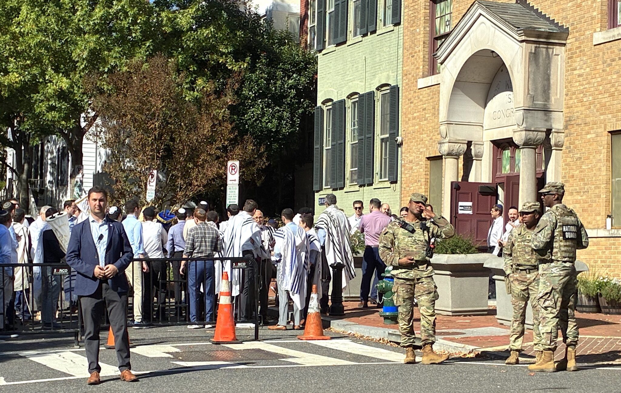 Kesher Israel congregation celebrates Simchat Torah on Oct. 15 protected by the National Guard. Photo by Peggy Sands.