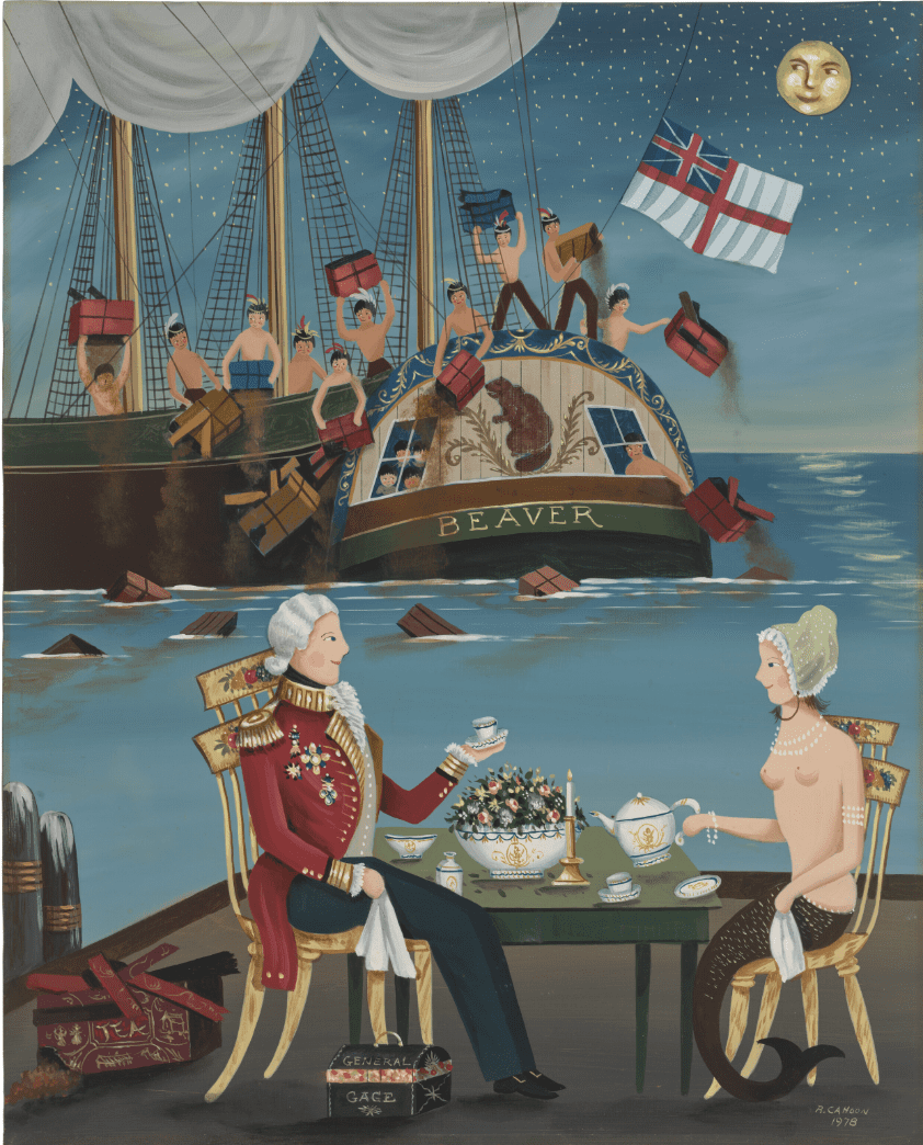Part of the Christie’s auction “We The People: America at 250,” this whimsical oil painting on Masonite by Ralph Cahoon (1910-1982) depicts the Boston Tea Party in the artist’s vibrant signature style, inspired by folk art. Selling for almost four times its high estimate, it is signed and dated “R. CAHOON /1978” in the lower right corner. Cahoon was a lifelong resident of Cape Cod; his house in Cotuit is now the Cahoon Museum of American Art.