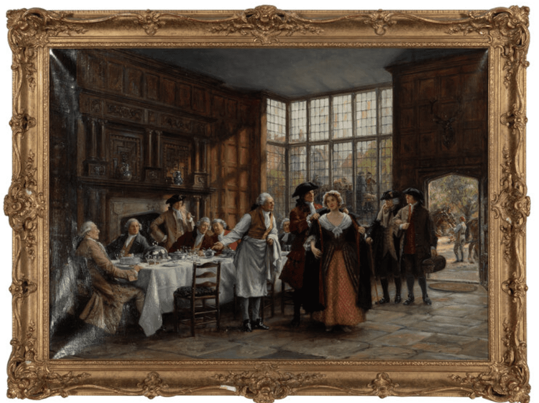 Selling for over seven times its high estimate, this oil by British painter Frank Moss Bennett (1874-1953), from a private collection, measures 30 by 40 inches and is signed in the lower left corner. Born in Liverpool, Bennett studied at the Slade School of Fine Art, the St John’s Wood Art School and the Royal Academy Schools. “The Heiress” is representative of Bennett’s historical genre paintings, which incorporate his costume and furniture research.