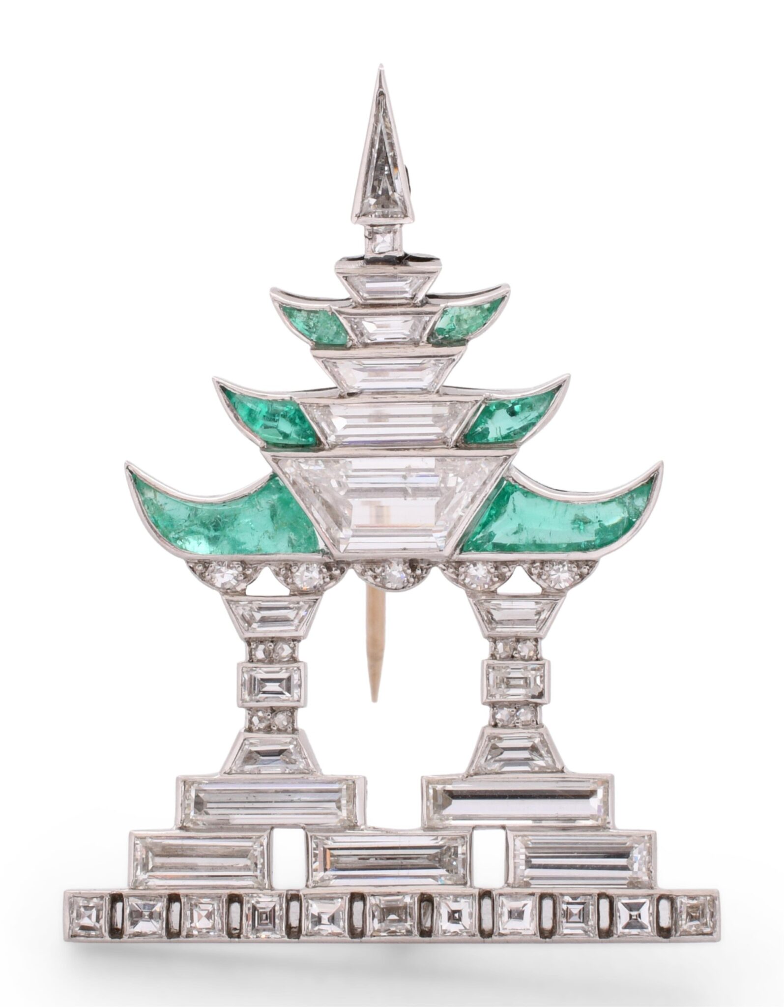 Janesich Pagoda Platinum, Emerald and Diamond Brooch