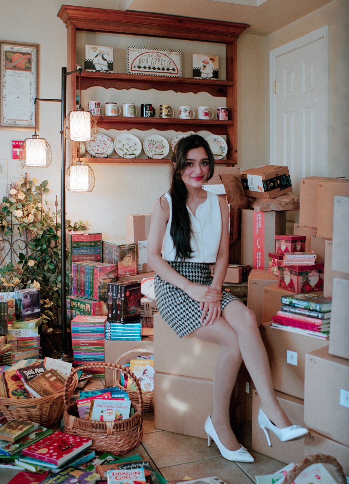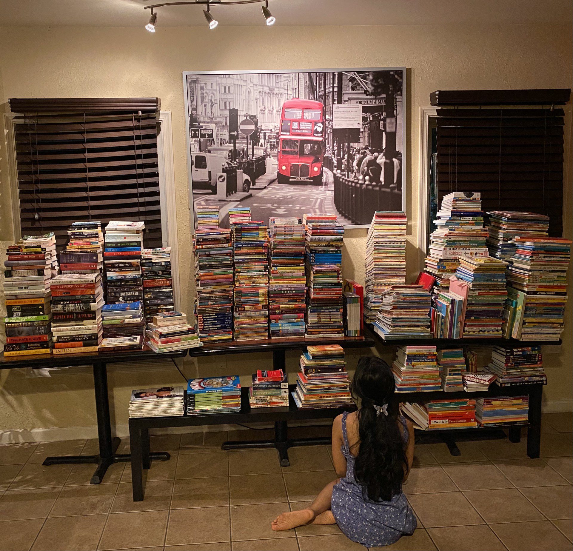 Bhatnagar gazing at all her books given as part of her book drive for the nonprofit For Love & Buttercup. Photo courtesy Emily Bhatnagar.