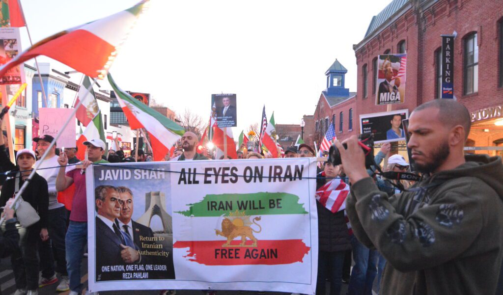 In Georgetown, a large rally of Iranian Americans and their supporters which favors a new democratic Iran and denounces the brutality of the 47-year-old Islamic republic made its way from Washington Harbour up Wisconsin Ave. then east on M Street in Georgetown on Saturday evening.